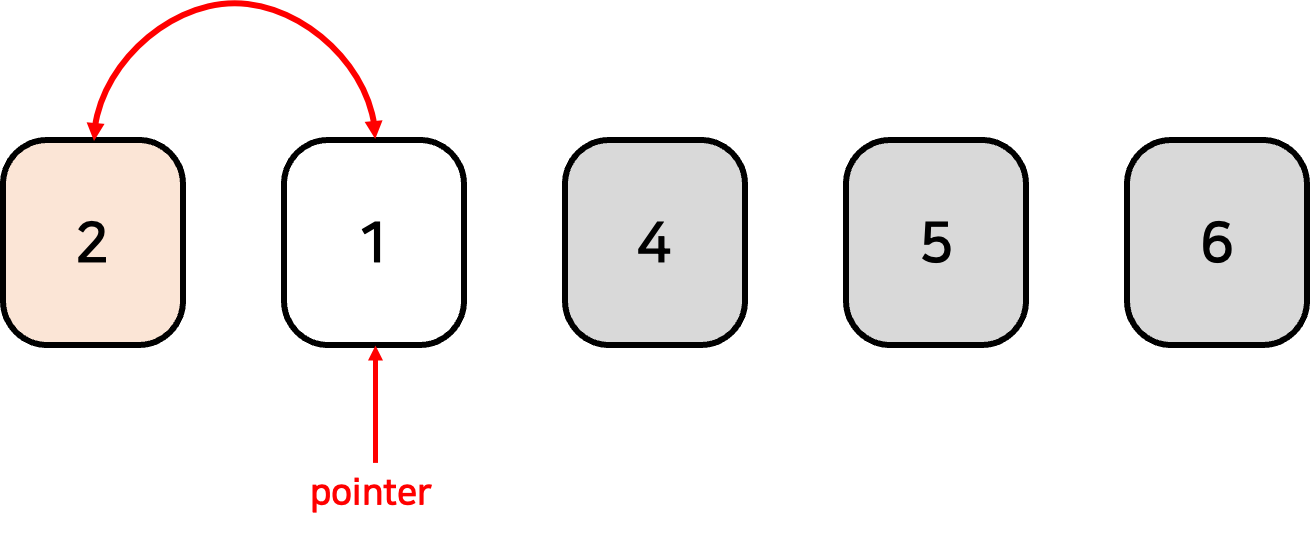 5. 5를 현재 포인터의 값인 2와 위치를 바꾼 후, 포인터를 하나 앞으로 옮긴다.