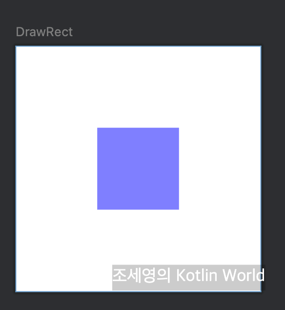Canvas의 크기가 300dp이므로, 중앙 지점은 150dp이다. 이에 100dp 크기의 정사각형이므로 정사각형의 왼쪽 상단 시작점은 (150-50)dp로 잡아야 한다. 따라서, 좌표계의 x, y좌표를 모두 100.dp.toPx()로 잡아서 사각형의 시작 지점을 만든다음, 사각형의 크기를 100dp로 잡으면 캔버스 정중앙에 100dp 크기의 파란색 정사각형을 그릴 수 있다.