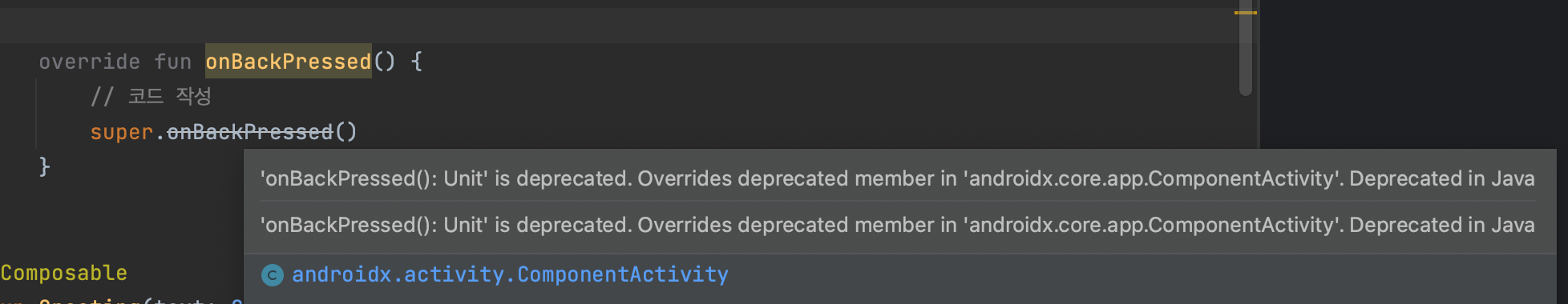 'onBackPressed(): Unit'은 더 이상 사용되지 않습니다. 'androidx.core.app.ComponentActivity'에서 더 이상 사용되지 않는 메서드를 재정의합니다.