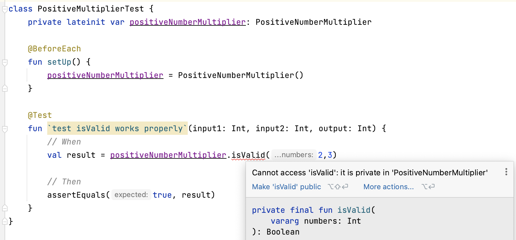 multiplyAll 함수에 대한 테스트를 실행하는 것은 문제가 없지만, isValid 함수는 private으로 선언되어 있어 테스트 시 접근성에 문제가 생긴다.