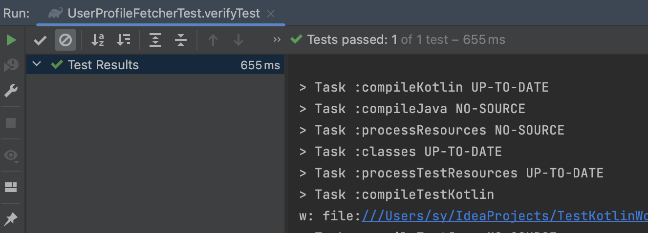 verify의 람다식에는 목 객체의 어떤 함수가 어떤 값으로 호출되었는지가 들어가며, 이를 통해 해당 함수가 호출되었는지 확인하는 테스트를 만들 수 있다. 위 테스트에서는 userProfileFetcher.getUserProfileById("0xffffffff")이 호출되었을 때 userRepository.getNameByUserId("0xffffffff")이 호출되었는지에 대한 테스트를 실행한다. UserProfileFetcher의 getUserProfileById가 호출되면 인자로 설정된 아이디로 UserRepository의 getNameByUserId함수를 호출하므로 이 테스트는 통과할 것이다.