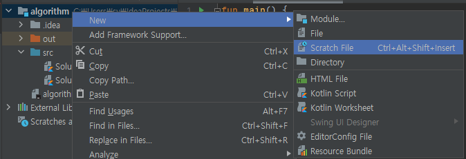 이 두가지 기초 지식을 바탕으로, Intellij는 작성한 코드를 돌리기 위한 방법을 제공합니다. 그 중 가장 많이 사용되는 두가지에 대해 살펴봅시다. 하나는 Class를 이용하여 코드를 돌리는 방식이고 다른 하나는 Scratch 파일을 이용하여 코드를 돌리는 방식입니다.