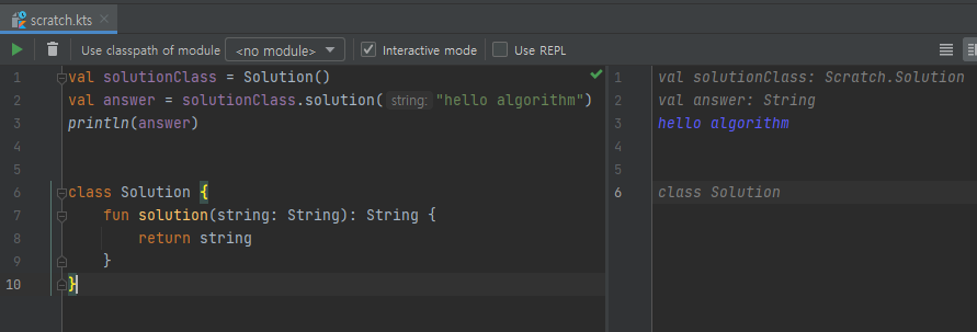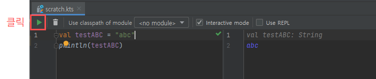 - 스크래치 파일에는 클래스 fun 모두 들어갈 수 있으며 Class와 다르게 fun main을 작성할 필요 없이 가장 바깥에 있는 코드를 돌려줍니다.