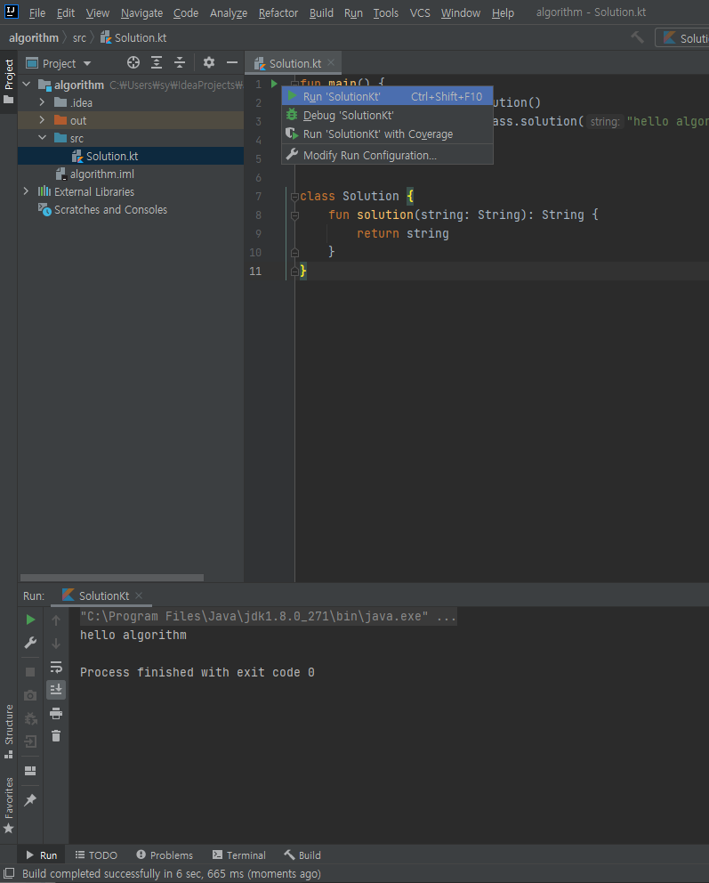 2. Run SolutionKt를 수행하면 다음과 같이 console에 출력됩니다.
