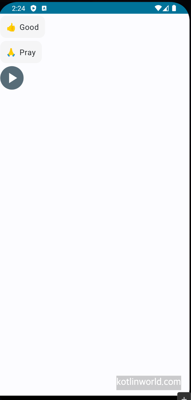 이 MainActivity는 Emoji와 Text가 함께 들어간 EmojiText 컴포저블과 Play 버튼을 Lazy Column을 통해 화면에 표시해 다음과 같은 화면을 표시한다.