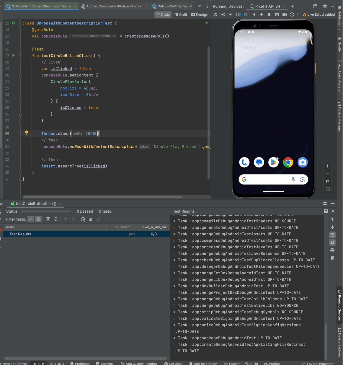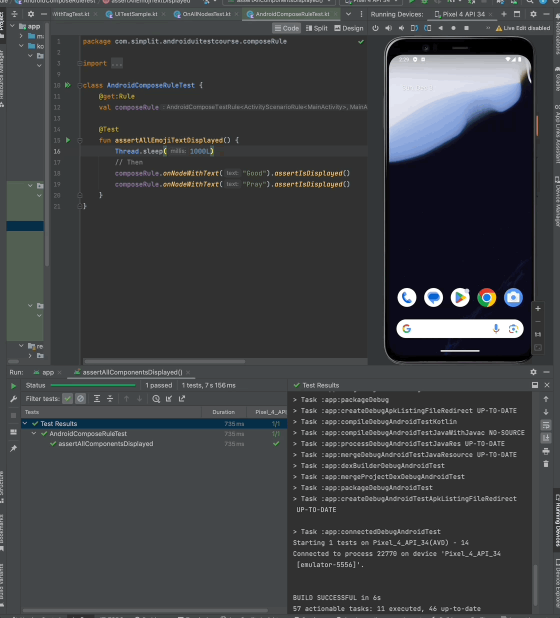 createAndroidComposeRule을 사용해 특정 Activity에 대한 테스트를 작성하면, 이미 화면이 구성되어 있기 때문에 composeRule.setContent를 사용하지 않으며, 화면상의 UI Node와의 인터렉션과 단언만을 실행하면 되는 것을 볼 수 있다. 아래 영상은 위 테스트를 실행해 본 결과이다.