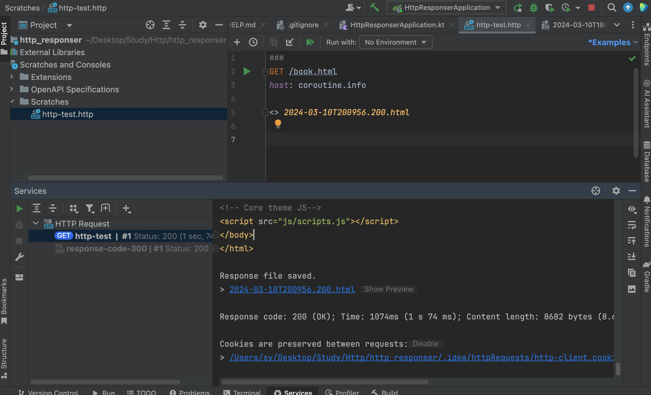 .http 파일을 만들었으면, 이번에는 HTTP Request를 작성할 차례다. HTTP Request의 형식에 맞춰 Request를 작성한다. 예를 들어 coroutine.info 링크의 book path의 리소스를 보고 싶으면 https://coroutine.info/book.html 링크의 리소스를 GET 메서드를 통해 가져와야 한다. 이는 다음과 같이 작성될 수 있다.
