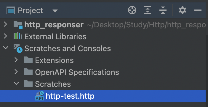 .http 파일은 IntelliJ의 Scratches and Consoles 탭의 Scratches 폴더에 만들어야 한다. 예를 들어 다음과 같이 http-test.http 파일을 만들 수 있다.