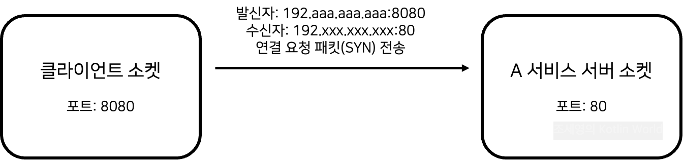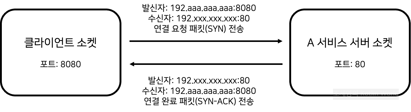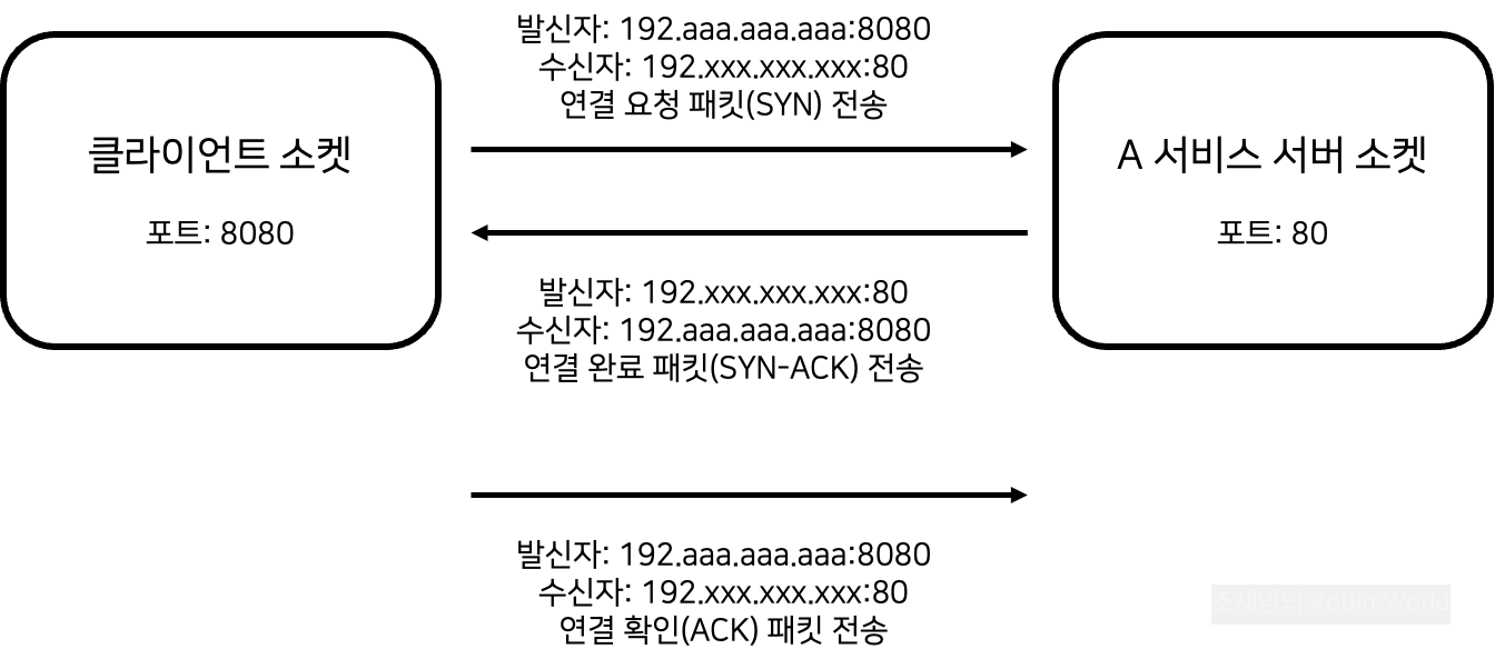 2. 클라이언트에서도 소켓을 만들고 서버의 IP 주소와 포트를 사용해 소켓에 연결을 요청(SYN)한다.