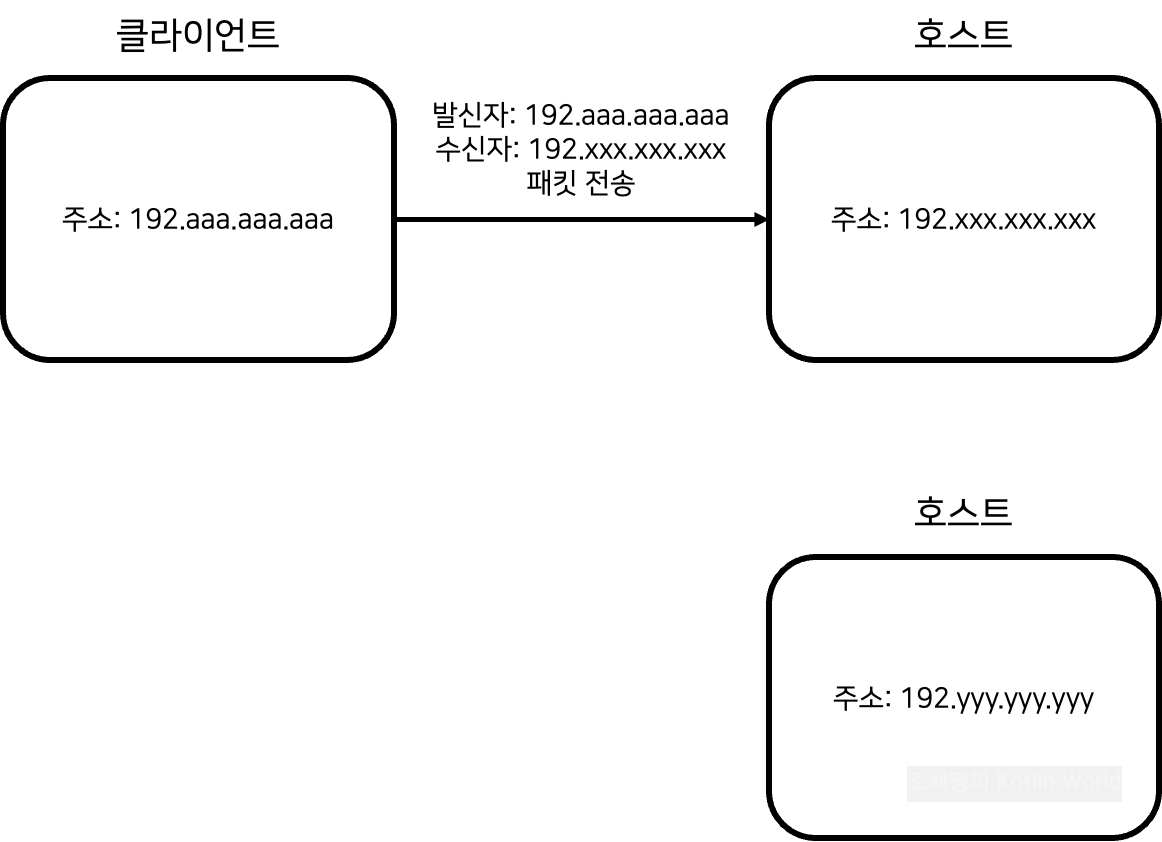 IP 레이어는 인터넷에서 데이터를 전송하기 위한 프로토콜로, 네트워크 상에서 각 기기를 식별하는데 사용하는 주소 체계이다. IP 주소를 사용해 특정 호스트로 데이터를 보낼 수 있다. 예를 들어 192.xxx.xxx.xxx 라는 IP 주소를 가진 호스트가 있다고 했을 때, 이 호스트로 데이터를 보내기 위해서는 192.xxx.xxx.xxx 주소로 데이터를 보내면 된다.