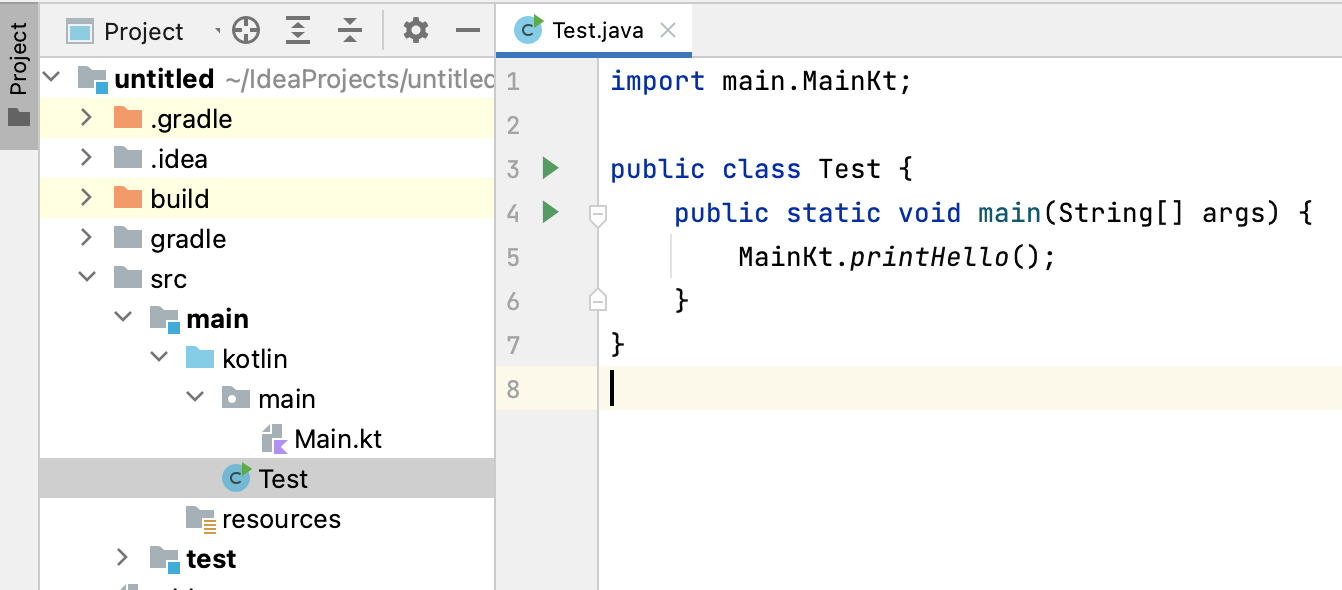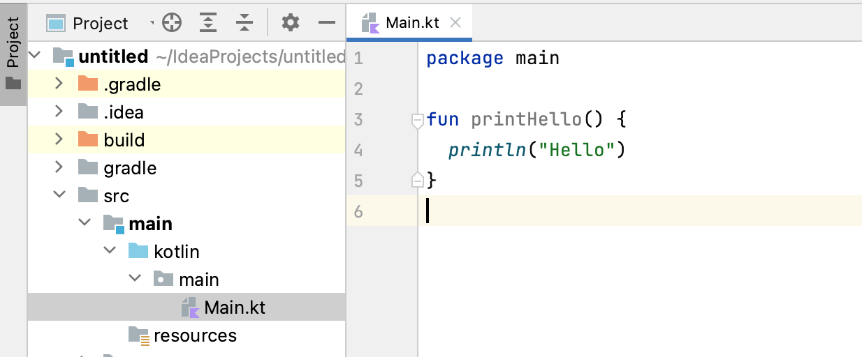 코틀린에서는 .kt 파일을 만든 다음 최상위에 함수를 선언하는 것이 허용된다. 예를 들어 다음과 같이 main 패키지 안에 선언된 Main.kt파일 내부에 printHello 함수가 선언되어 있다고 해보자.