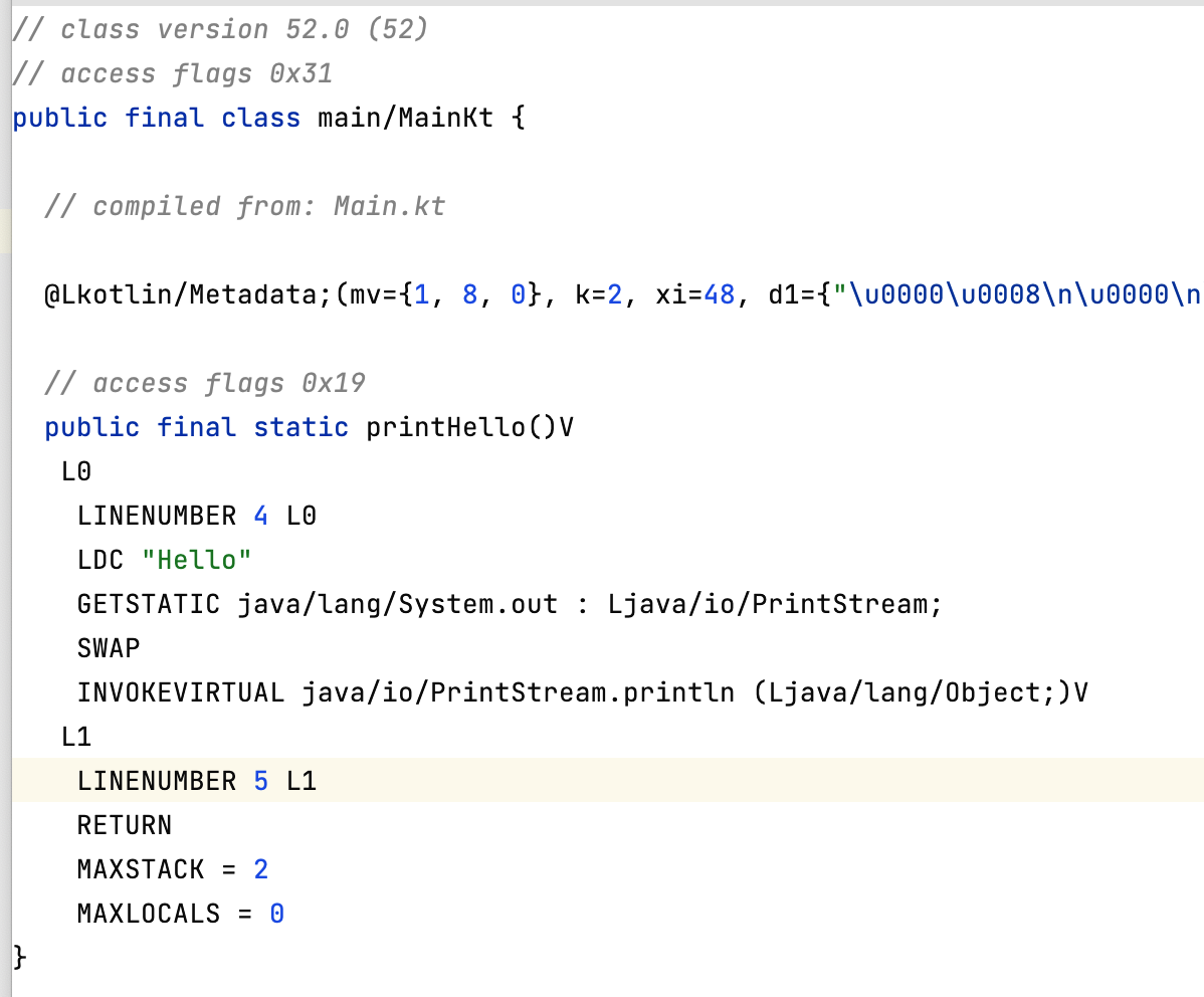 우리가 이를 바이트 코드로 컴파일 하면 다음과 같이 MainKt.class 파일이 생성되며, 이 MainKt 클래스 내부에는 printHello 함수가 정적 함수로 선언된다.