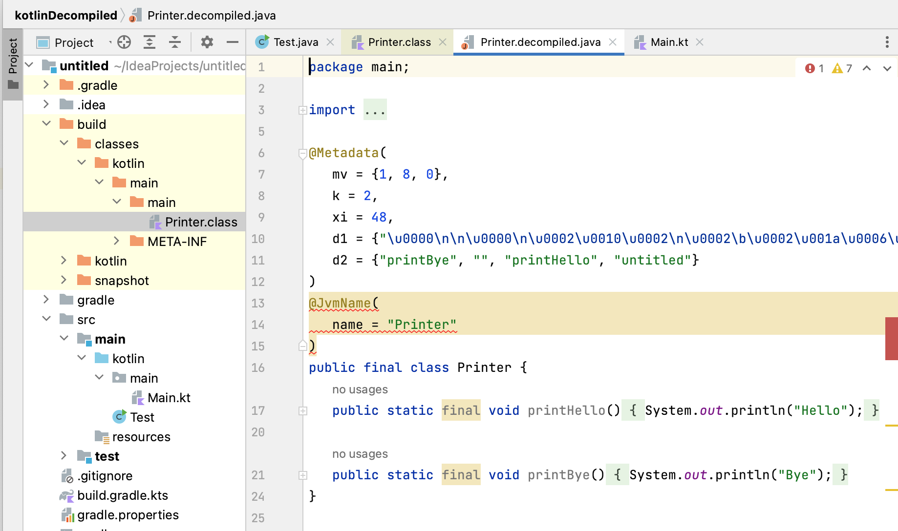 다시 빌드를 해보면 MainKt.class 대신 Printer.class가 생성된 것을 확인할 수 있다.