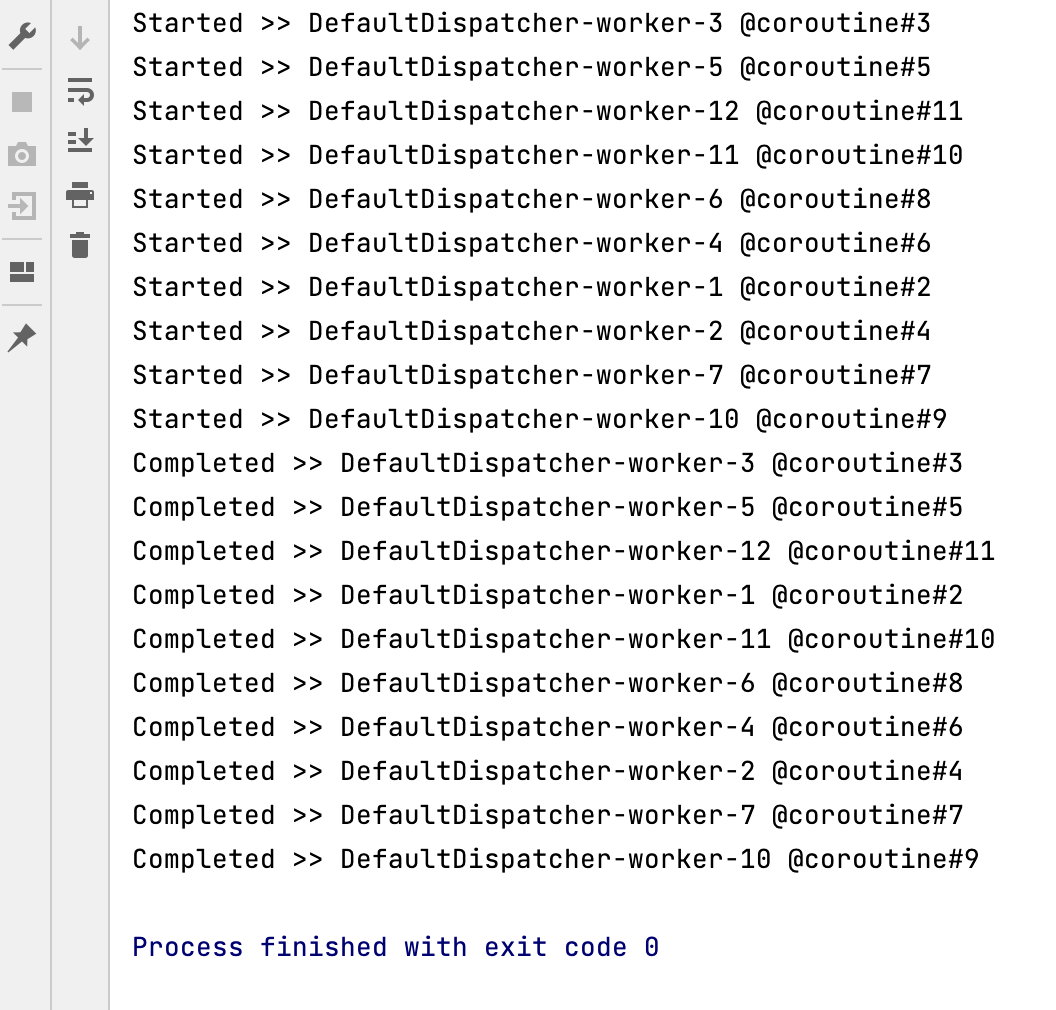 위 코드에서는 10개의 코루틴이 Dispatchers.IO를 사용해 실행된다. 각 코루틴은 내부에서 ReentrantLock을 사용해 락을 만들고 1초간 대기 후 해제하므로, 위 코드는 문제없이 실행될 수 있을 것처럼 보인다. 하지만 실제로 위 코드를 실행해 보면 다음과 같이 코루틴의 실행이 끝나지 않는 것을 볼 수 있다.
