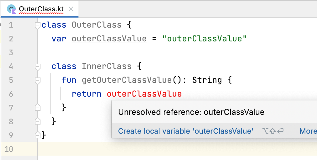 자바에서는 내부에 선언되는 중첩 클래스에서 기본적으로 바깥쪽 클래스의 변수를 참조할 수 있었다. 예를 들어 다음과 같이 OuterClass와 InnerClass가 있는 경우 InnerClass의 함수인 getOuterClassValue에서 OuterClass의 변수인 outerClassValue를 참조할 수 있었다.