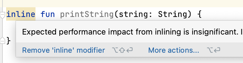참고로, 람다식을 인자로 받지 않는 함수는 inline fun으로 선언해도 별 의미가 없다. 예를 들어 다음과 같은 함수를 보자.