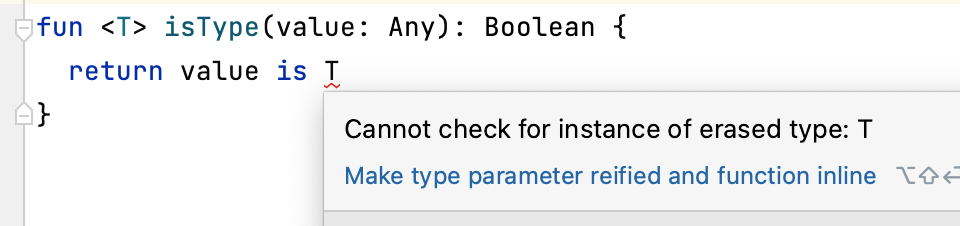 JVM은 제네릭 타입을 실행 시점에 지원하지 않기 때문에, 자바의 제네릭과 마찬가지로 코틀린의 제네릭 또한 컴파일 타입에 타입 지워짐(Type Erasure)이 발생한다. 이 때문에 제네릭을 사용하는 일반 함수에서는 함수 본문에서 제네릭 타입을 이용해 연산을 할 수 없다. 예를 들어 다음과 isType 함수를 살펴 보자.