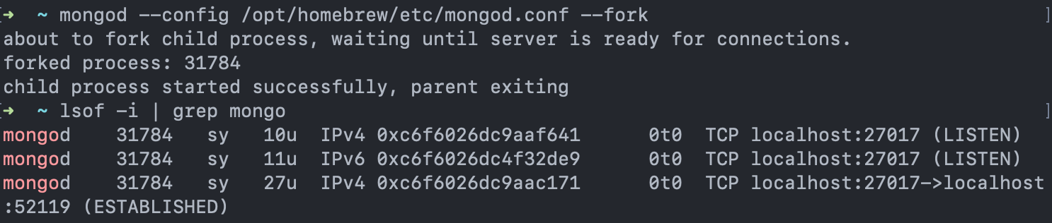 이제 다시 MongoDB를 실행하고 프로세스의 포트를 확인하면 27000번 포트로 실행이 된 것을 확인할 수 있다. 다음은 내 macOS에서 실행한 결과이다. 마지막 줄에서 27000번 포트에서 실행되고 있는 것을 볼 수 있다.