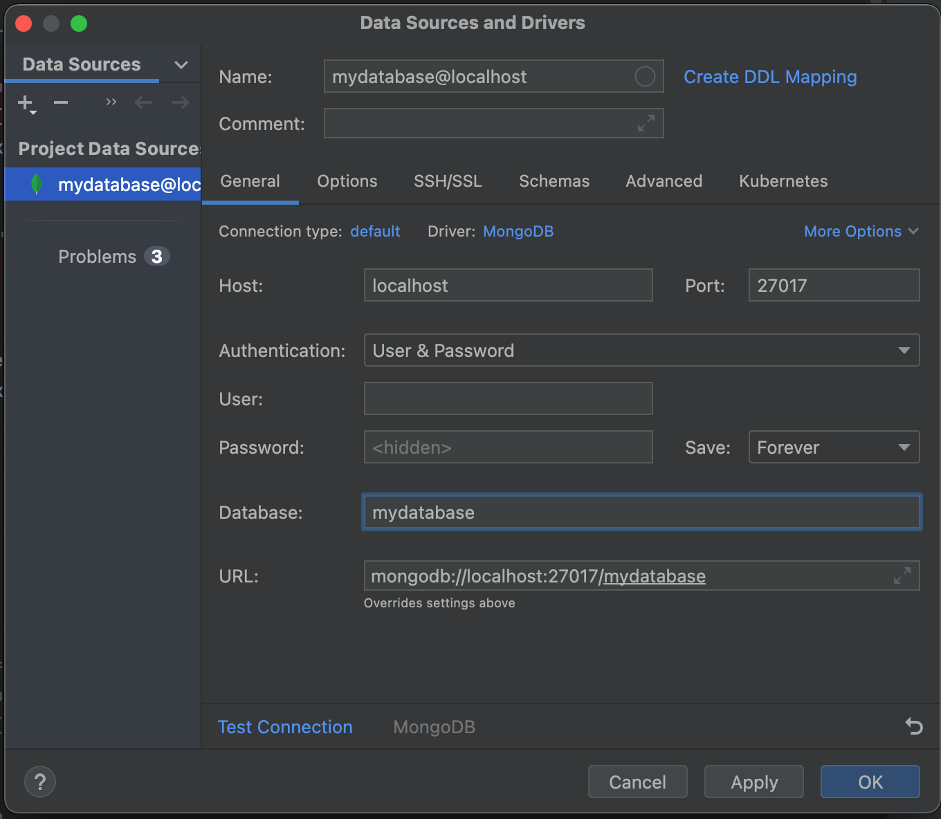 Host에는 호스트 이름을(여기서는 localhost) Port에는 설정한 포트 정보를 쓴다. 포트를 설정한 적이 없다면, 기본 포트인 27017 번을 사용할 가능성이 크다. 마지막으로 Database에는 MongoDB에서 관찰할 데이터베이스의 이름을 쓴다. 나는 내 스프링 프로젝트에서 mydatabase라는 이름의 데이터 베이스를 사용하고 있기 때문에 다음과 같이 작성했다.