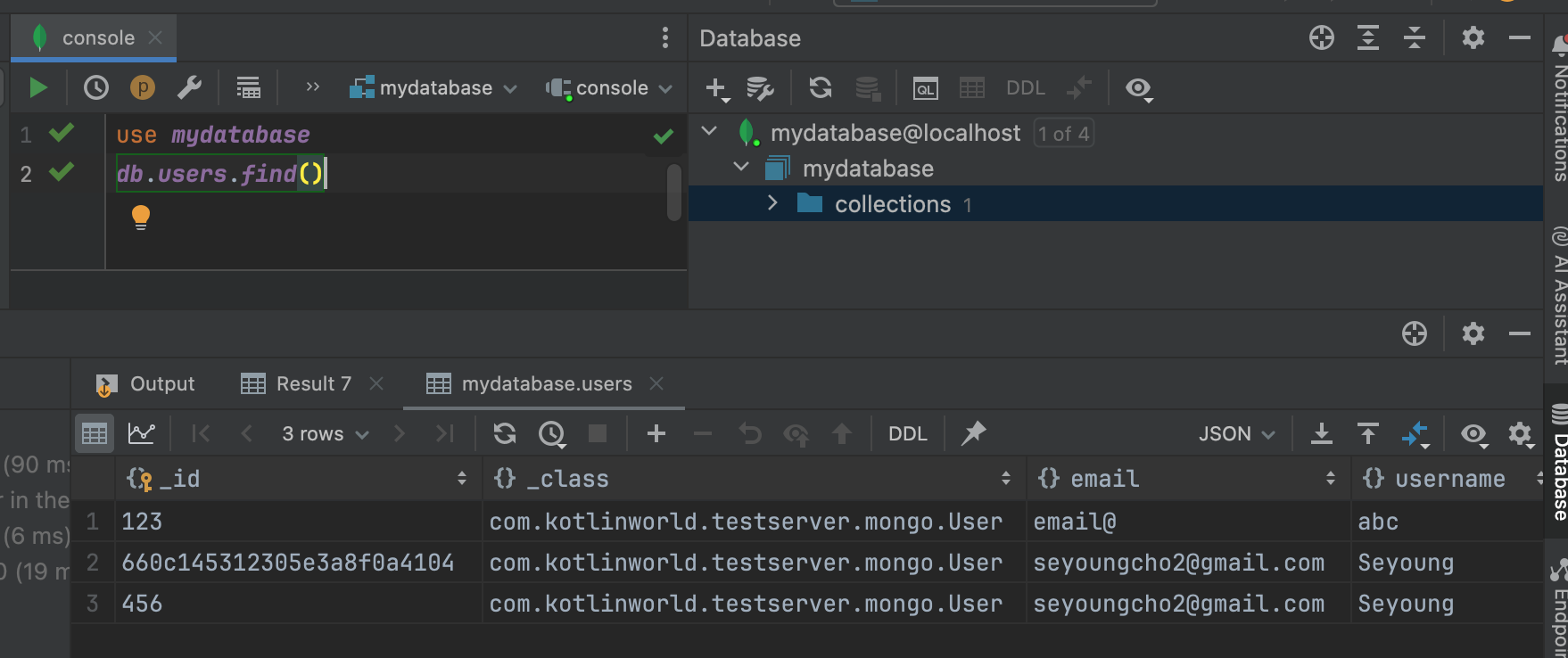 여기까지 IntelliJ에 MongoDB를 연결하고, 내부의 데이터를 조회하는 방법에 대해 알아봤다.