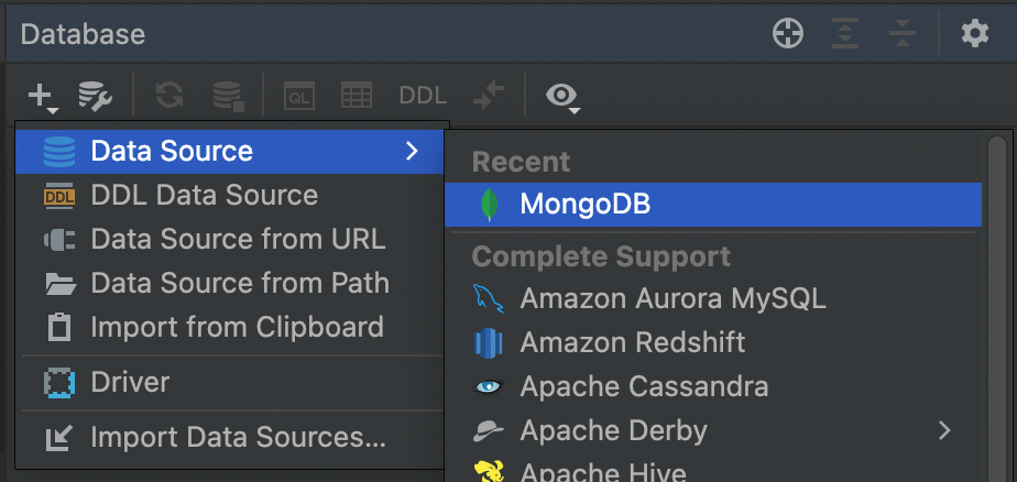MongoDB를 모니터링 하기 위해서는 실행 중인 MongoDB 정보를 추가해야 한다. 데이터베이스 탭에서 + 버튼 - Data Source - MongoDB를 누른다.