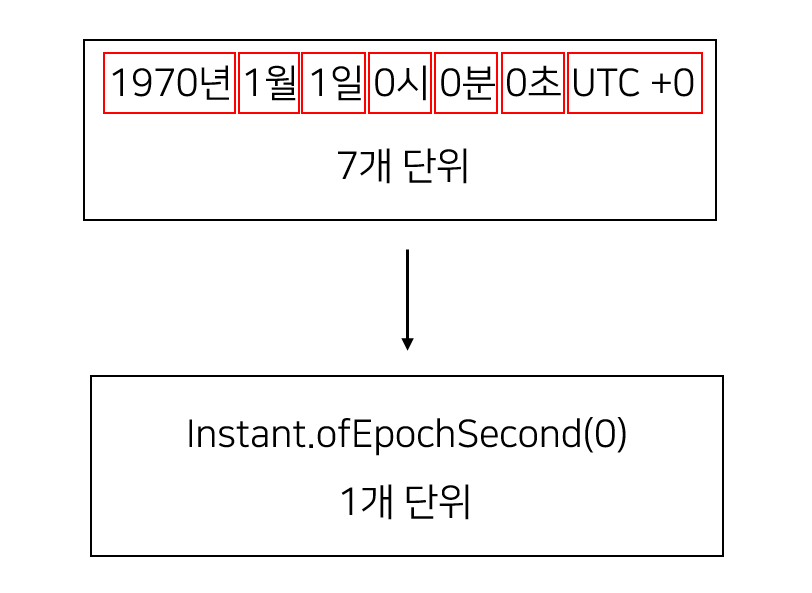 예를 들어 1970년 1월 1일 0시 0분 0초 UTC+0 이라는 시간 단위는 년, 월, 일, 시, 분, 초, 시간대 라는 7개 단위로 이루어져 있다. 이 시간은 기준점인 1970년 1월 1일 0시 0분 0초 UTC+0 을 절대값을 준다음 그로부터 지난 시간만 저장한다면 0초라는 1개의 단위로 저장 가능하다.