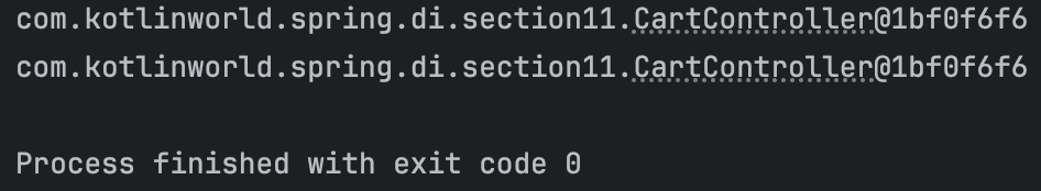 그러면 이 CartProvider은 여러번 호출해도 같은 객체가 반환된다. 이를 확인하기 위해 getBean(CartController::class.java)를 두 번 호출하고 출력을 확인해보자.