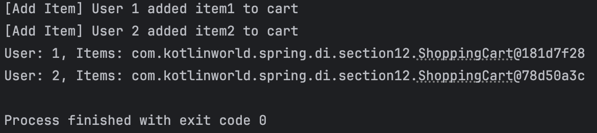 이 코드에서는 CartController Bean을 가져온 후 userId "1"에 "item1" 을 더하고 userId "2"에 "item2" 를 더한다. 그런 후 만들어진 shoppingCartMap의 모든 key-value 쌍을 출력한다. 이제 코드를 실행해보자. 그러면 다음과 같은 결과가 나온다.