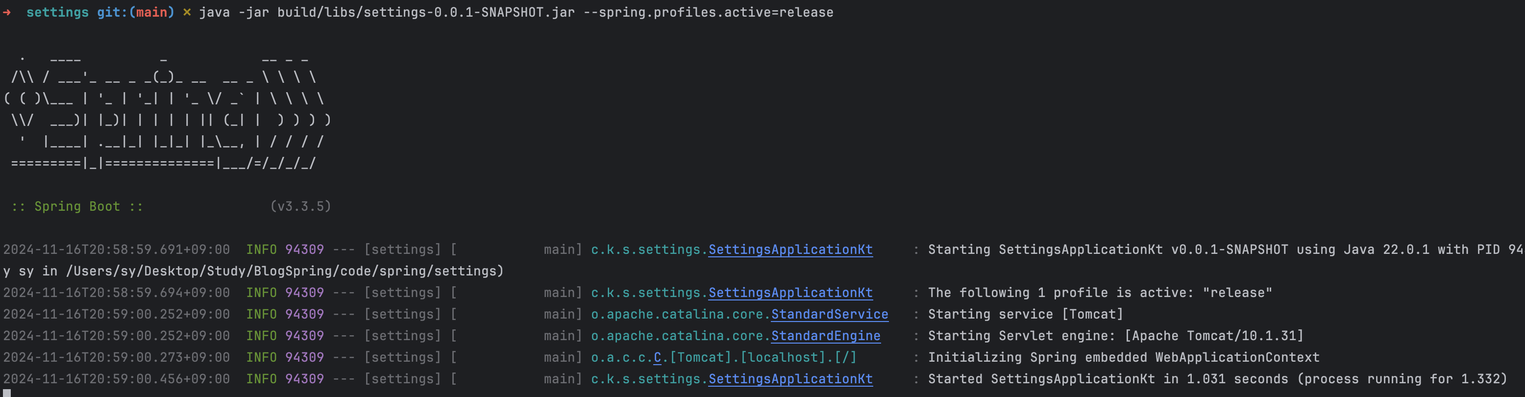 이제 다음 명령어를 사용해 application-release.properties를 사용하도록 설정해 애플리케이션을 실행해보자.