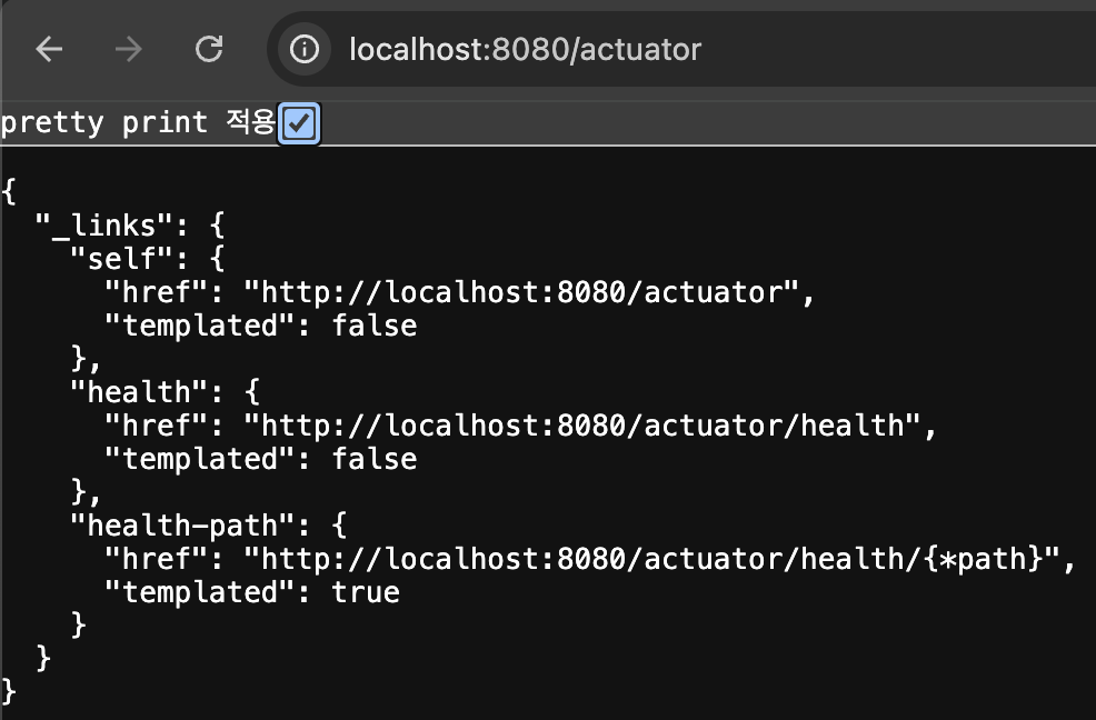 이것을 추가하고, 애플리케이션을 실행해보자. 이후 localhost:8080/actuator 에 접속하면 다음과 같은 화면이 나온다.