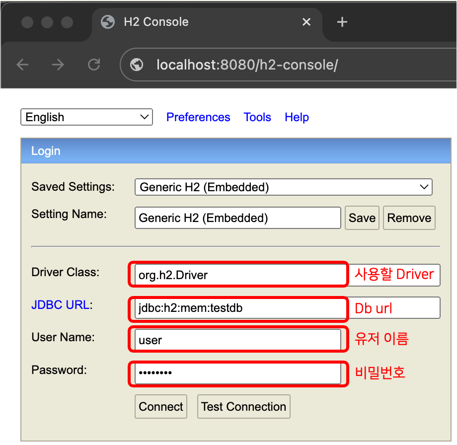 예를 들어 jdbc:h2:mem:testdb 를 통해 db에 접근하면서 org.h2.Driver 드라이버를 사용하고, 사용자 이름은 user 비밀번호는 password으로 설정하고 싶다면 다음과 같이 설정해주면 된다.