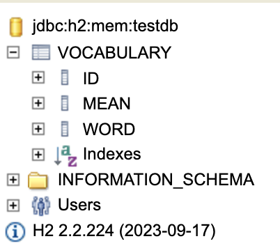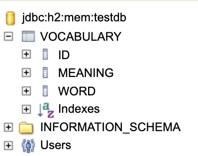 이 테이블의 이름은 클래스의 이름과 같은 Vocabulary가 되며, 내부에는 아이디 id, 단어 word, 뜻 meaning 세가지 필드를 가진다. 테이블에는 꼭 Primary Key가 필요하기 때문에 id 변수 위에는 @Id 어노테이션을 붙여 이 필드가 Primary Key라는 것을 알려야 한다. 이렇게 만든 후 스프링 애플리케이션을 실행하면 다음과 같이 VOCABULARY 테이블과 내부에 선언된 ID, MEANING, WORD 컬럼을 확인할 수 있다.