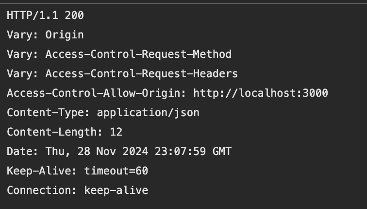 이제 이렇게 설정한 후 리액트 애플리케이션에서 스프링 애플리케이션에 HTTP 요청을 실행해보면, 다음과 같은 헤더와 함께 성공 응답이 오는 것을 볼 수 있다.
