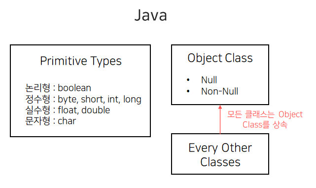 Primitive type은 Object Class를 상속하지 않으며, 별도 타입으로 분류된다. 물론 Primitive Type의 박싱된 타입인 Boolean, Integer 등은 Object Class를 상속받는다. Primitive type 외의 모든 클래스는 Object Class를 상속 받으며, Object Class는 Nullable 해서 null 값이 들어갈 수 있다. 요약하면 모든 Java Class의 최상위 클래스는 Object Class가 된다.