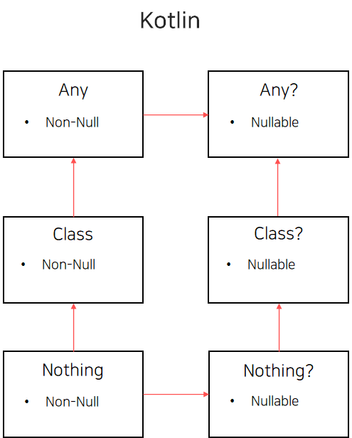 Kotlin의 타입 시스템은 자바와는 조금 다르다. Kotlin은 Null Safety에 초점을 맞추어 타입 시스템이 설계되었다. Kotlin의 타입 시스템은 크게 Nullable 하지 않은 Any와 Nullable한 Any? 나뉜다.