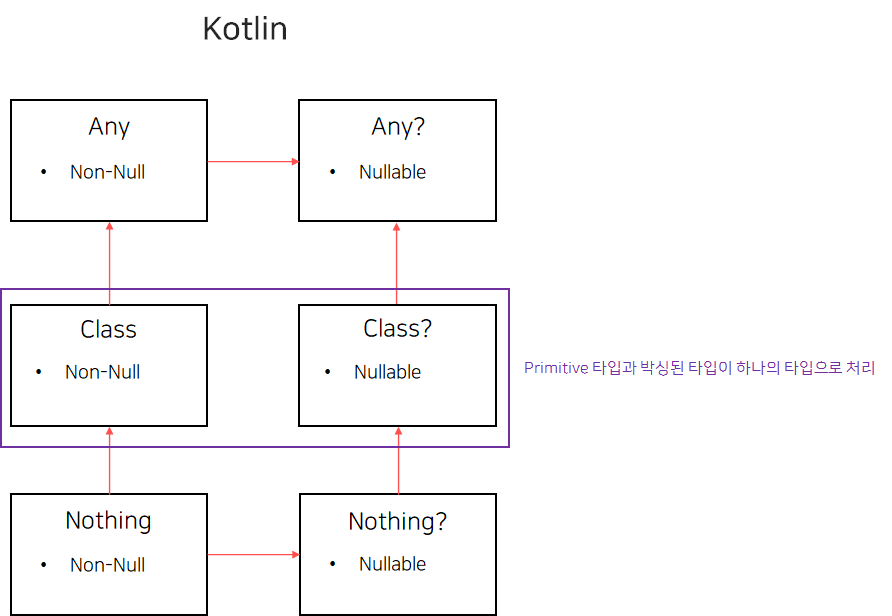 또한 자바와는 다르게 원시 타입은 따로 존재하지 않으며, 자바와 다르게 원시 타입을 따로 boxing unboxing 할 필요 없이 Wrapping된 하나의 클래스로 사용한다. 이 클래스는 Any혹은 Any?를 상속 받는다.