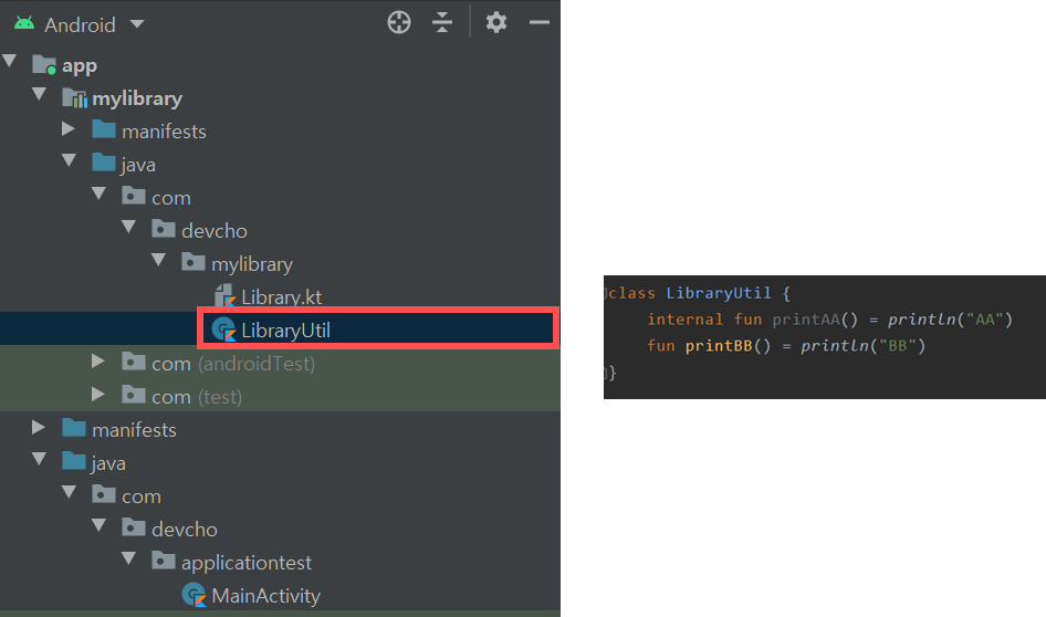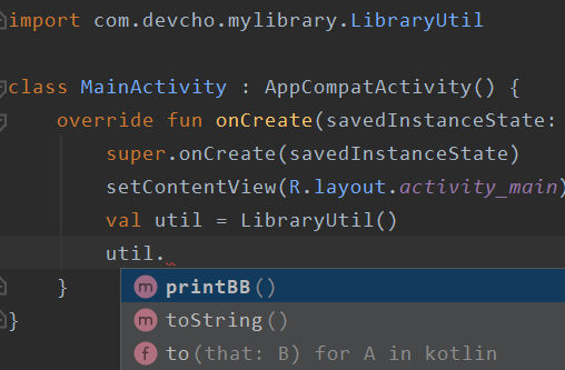 이제 다른 모듈인 MainActivity에서 LibraryUtil의 메서드에 접근해보자. 그림3과 같이 public fun인 printBB()에만 접근이 가능한 것을 볼 수 있다. internal fun에는 접근이 불가능하다.
