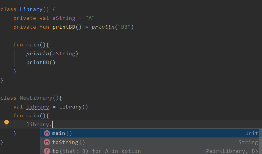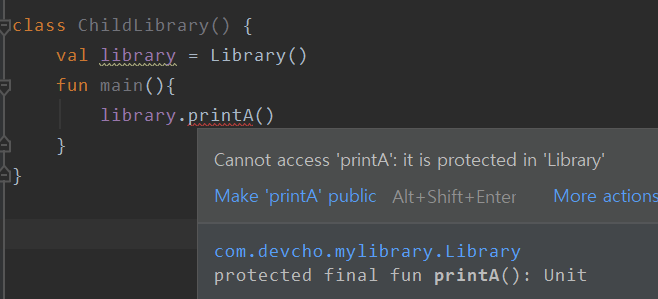 우리는 이러한 상황에서 같은 모듈인 Library.kt에서 해당 LibraryUtil을 인스턴스화할 때 접근 가능한 메서드의 목록과, 다른 모듈인 MainActivity에서 LibraryUtil을 인스턴스화할 때 접근 가능한 메서드의 목록을 살펴볼 것이다.