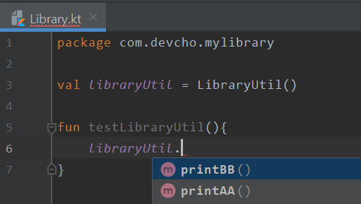 먼저 같은 모듈인 Library.kt에서 LibraryUtil의 메서드에 접근해보자. 그림2와 같이 public fun인 printBB()와 internal fun인 printAA()메서드에 모두 접근이 가능하다.