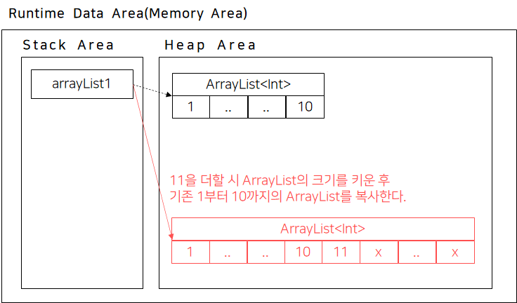 만약 <그림2와> 같이 List에 인스턴스가 더해져 메모리 공간이 모두 찬다면 다시 해당 메모리 공간보다 더 큰 메모리 공간을 잡아 기존 객체를 복사한 다음 연산을 이어간다.