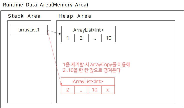 예를 들어 1..10의 원소를 가진 ArrayList가 있다고 했을 때 이중 1을 제거하기 위해서는 2..10을 앞으로 땡겨오는 방법을 사용한다. 이러한 과정을 통해 원소 삭제 시 Index가 유효하게 유지된다.